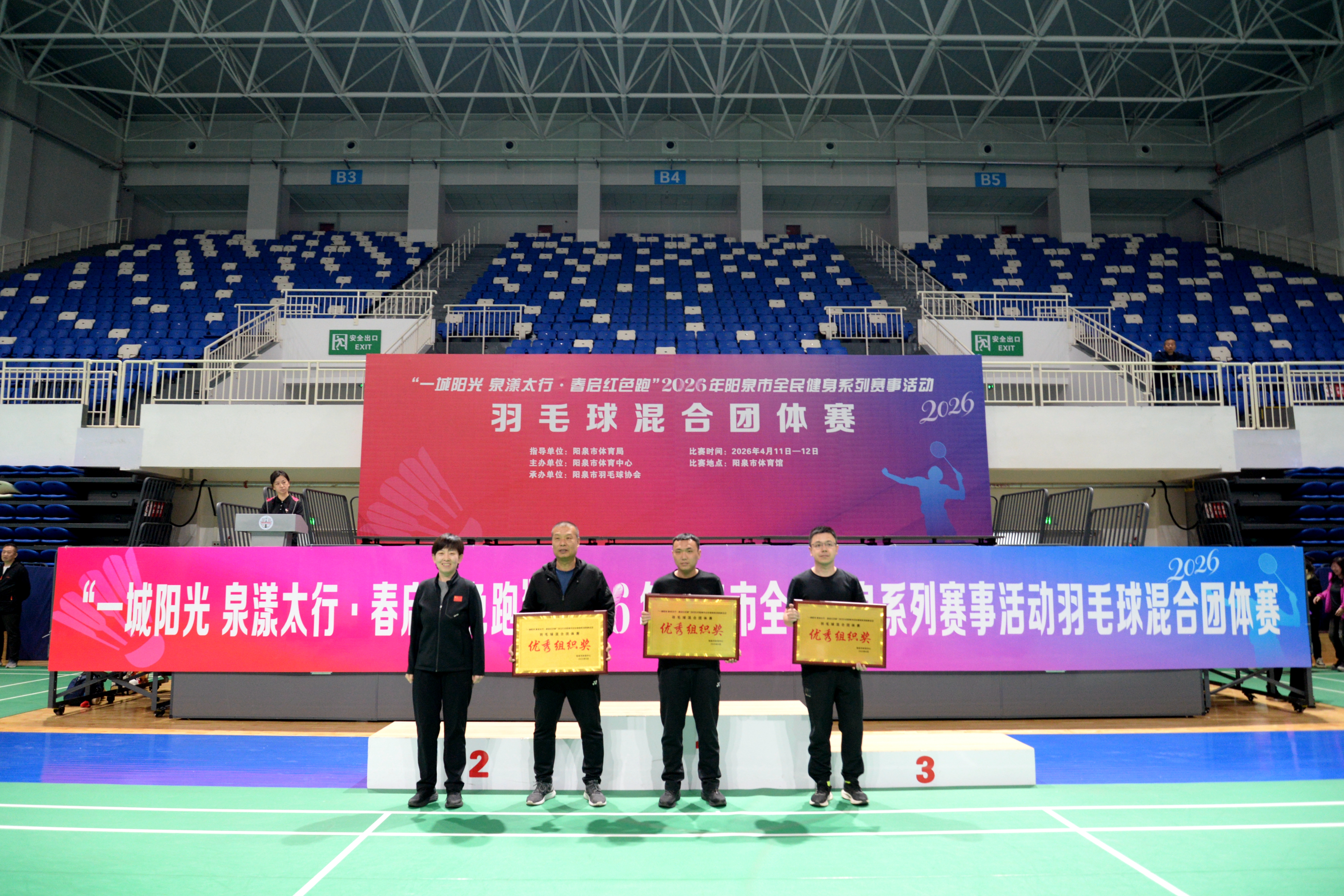 4月11-12日,由阳泉市体育局指导、阳泉市体育中心主办、阳泉市羽毛球协会承办的“一城阳光 泉漾太行·春启红色跑”2026年阳泉市全民健身系列赛事活动羽毛球混合团体赛在阳泉市体育馆举办。比赛为期两天,共有来自阳泉市58支代表队700余名运动员挥拍上阵、同台竞技,为球迷们献上了一场精彩纷呈的羽毛球盛宴。